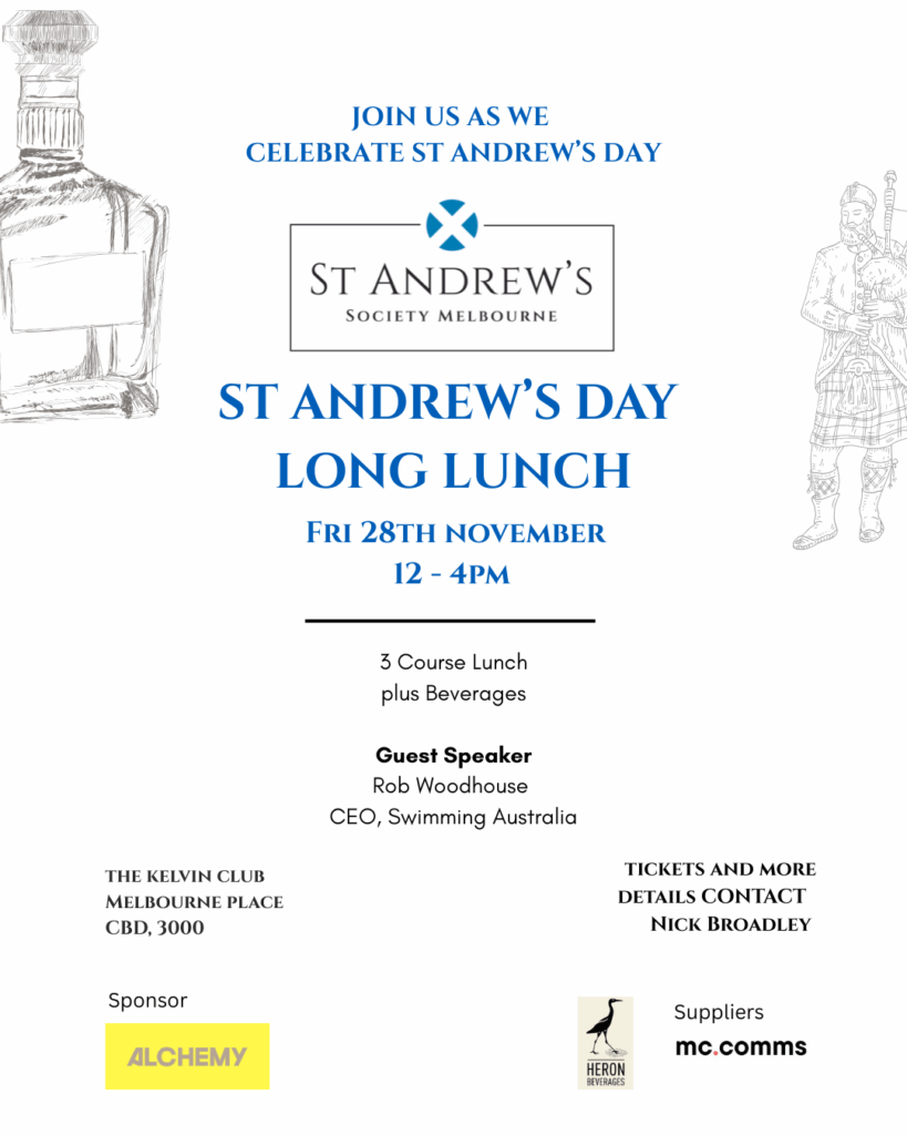 Our next event in 2024 will be in November where we will Celebrate St Andrew’s Day at our annual Long Lunch in Melbournes CBD.